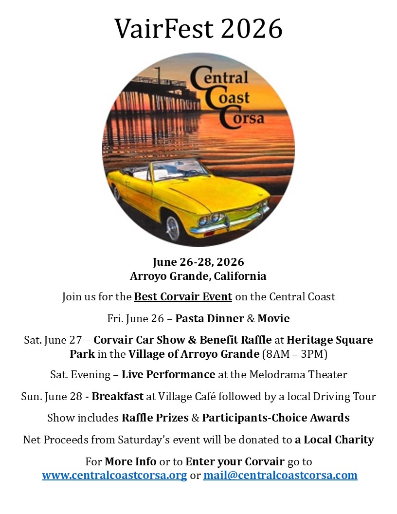 June 26-28 Fri-Sun - Central Coast Corsa’s Vair Fest - Arroyo Grande. A great Corvair weekend on the Central Coast. For information and registration form go to http://www.centralcoastcorsa.org/ See FLYER, and REGISTRATION FORM