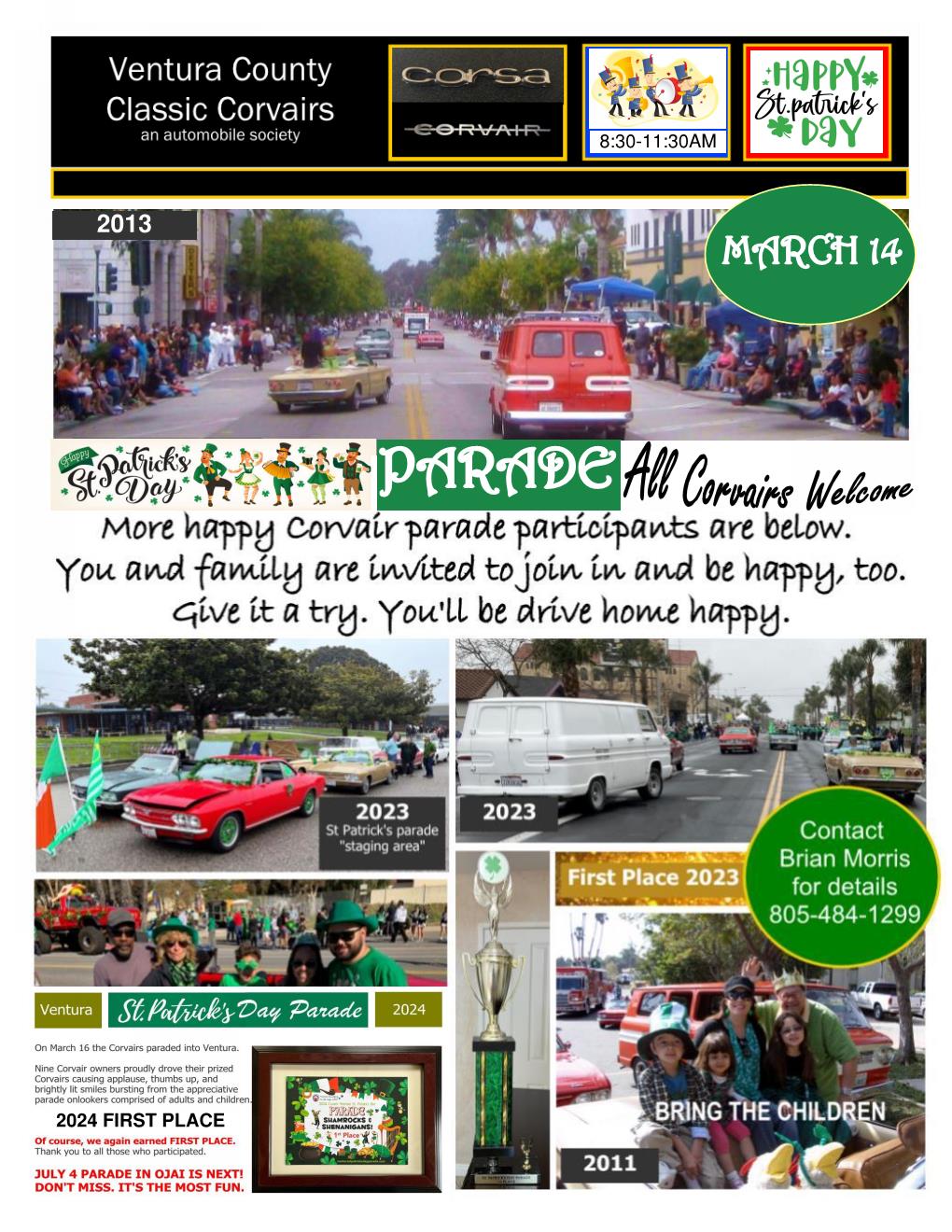 March 14, Saturday 8:30AM – Ventura St Patrick’s Day Parade – sponsored by Ventura County Classic Corvairs. Contact Brian Morris for interest. (805)484-1299- See FLYER for info